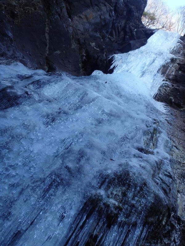 <天気晴れ>寒いが、晴れて赤城山、榛名山、西上州、秩父の山並がはっきりと見える。関越道を渋滞無く快調に走る。妙義山が近づき、岩峰が空に突き刺さるような景色を見て、松井田妙義ICを下りる。横川駅、鉄道文化村を過ぎて、すぐに碓井川近くの駐車場に着いた。トイレあり、先客なく、ひっそりとしている。周囲の山々は陽に照らされているが対岸の山は北向きで暗い。支度をして出発する。麻苧大吊橋を渡る。渡って左の道を進む。山裾の池は全面結氷している。登り口の大岩の下には石の祠があり「銭洗弁財天」の石柱が建っている。この谷は信仰、修行の場であったらしい。ここからは沢沿いの山道に入り、斜度が増し、道にはかなりの落ち葉が積もっている。沢には直径数㍍の大岩が転がっている。日陰になり寒い。小橋を渡り、登ること10分ほどで沢の奥に白い氷瀑が現われた。全面結氷した高い(高さ40m)氷瀑だ。沢も凍っていて水は無く、滝下まで行く。滝の下の部分は数㍍幅の氷柱が重なり見事。上の方も氷瀑だ。左右の岩壁が垂直に立ち上がり黒々していて迫力ある。そこには灌木、枯草が生え、小鳥が飛び回っている。滝壺も凍り付いていて、透明な氷の下30cmほどまで見える。白く輝く素晴らしい氷瀑が見られた。