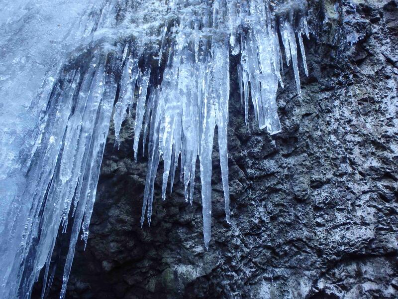 大氷柱入口の岩の間を下るところを見逃して、少し先から左に入れば、下の方に踏み跡が見える。これを辿って尾根を登れば奥壁の下をトラバースして大氷柱が見えて来た。この間の冷え込みで氷結が始まったらしい。期待してなかったご褒美に「ラッキー!!」