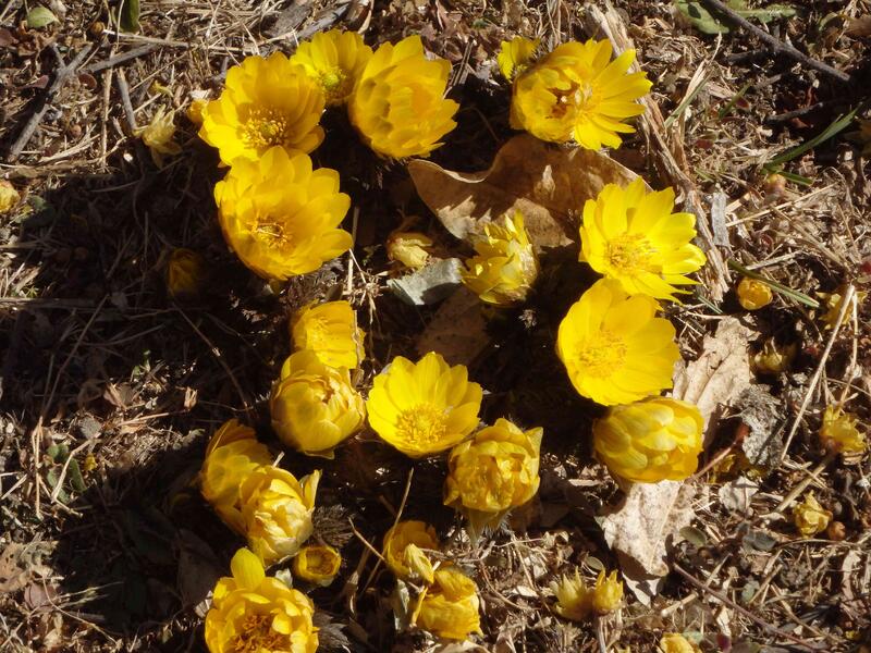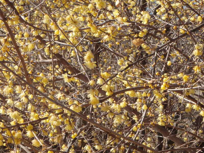 上:穏やかに咲く蝋梅 下:春の陽を受け咲く福寿草は心も暖まる