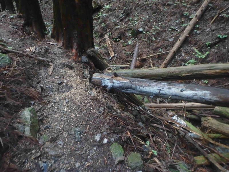 林道に至る。林道は石間、上吉田間を通る車道だが、現在、崖崩れのため通り抜けはできない。一旦、車道に出て、尾根に登る道を探す。急ではあるが南側から、登れそうと判断し、そこを登る。落葉、泥があり、掴まる木が少ないなどの悪条件で、大した標高差ではないが、30分ほどかかってしまった。